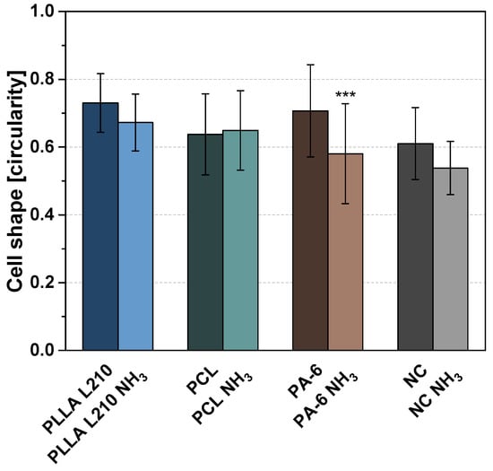 Cell shape described by cell circularity of human endothelial EA.hy926 cells on untreated and NH3-plasma functionalized polymeric nonwovens after 48 h (mean + SD, n = 40, one-way ANOVA, *** p < 0.001).