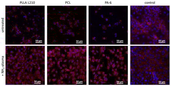 Fluorescent staining of F-actin in human endothelial EA.hy926 cells grown for 48 h on untreated and NH3-plasma functionalized polymeric nonwovens (red: phalloidin-TRITC for F-actin, blue: Hoechst-staining indicating cell nuclei, confocal microscopy, and bar = 50 μm).