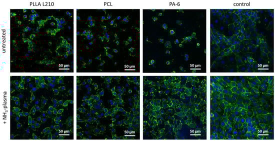 Regarding phenotype maintenance, the morphology of human EA.hy926 cells grown on the NH3-plasma modified polymeric nonwovens was comparable to those on the control surface (NC), although on the control surface, cells generally exhibited a much larger cell area compared to those on all of the polymeric nonwovens.