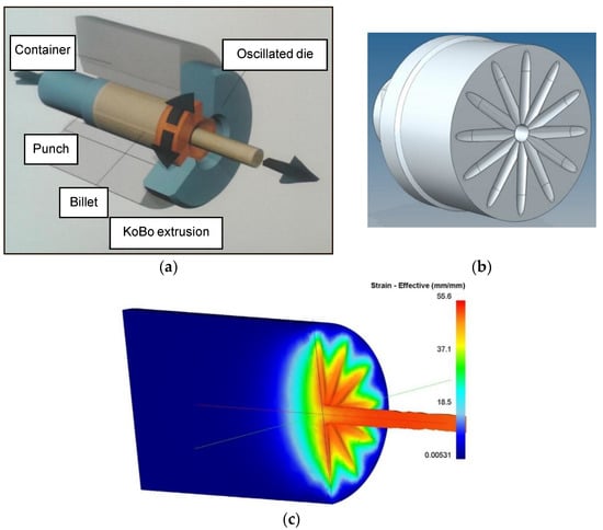 Scheme of KoBo extrusion process (a), view of die used for extrusion (b), result of FEM computer simulation of extrusion process, (c) deformation intensity distribution.