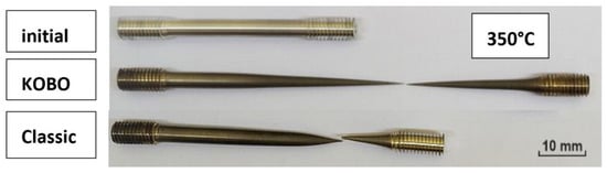 Table 5 shows the results obtained in a static tensile test for samples after conventional extrusion and KoBo extrusion at 300 °C and 350 °C and at a strain rate of 0.0001 m·s−1. The tensile test conducted at temperatures of 300 °C and 350 °C for the WE43 alloy after deformation using the KoBo method showed better plastic properties. At 300 °C, the obtained elongation amounted to 85%. At 350 °C, superplastic flow and elongation values of 250% were observed.