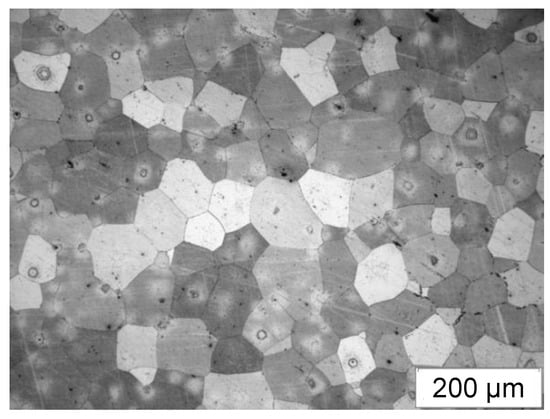 Figure 3 presents an example microstructure of the WE43 alloy after the processes of casting and heat treatment. After the casting process and heat treatment, the WE43 alloy was characterized by a coarse-grained microstructure with varied sizes of grain (Figure 3). In the initial state, the grain mean diameter was about 70 μm (Table 2). The phase composition of the WE43 alloy in its initial state was identified using an X-ray phase analysis. The presence of α-Mg solid solution and phase Mg41Nd5 was demonstrated in previous studies [18].