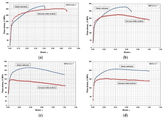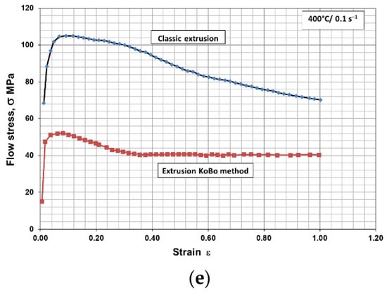 From the flow curves, mathematical relationships were developed between the process parameters and the mechanical properties determined in a plastometric compression test. From the stress–strain curves (Figure 6), the values of maximum flow stress σpmax and the corresponding strain εp were read out. A comparison of the stress–strain curves for the WE43 alloy specimens after coextrusion and combined extrusion after compression at 400 °C and at a rate of 0.1 s-1 is shown in Figure 5e. The compressed specimens strengthen, and when the maximum stress is reached, this value is reduced to a preset strain of ε = 1. The value of stress is much higher for the sample after coextrusion than after combined extrusion. In the compressed sample, extruded using the KoBo method, after strengthening and exceeding a strain of 0.3, the stress remains at a constant value, which shows that the so-called “steady state flow” has been reached. This testifies to a complete and cyclic dynamic recrystallization. The determined values of flow stress σpmax and the corresponding strain εp for samples—which, after extrusion and after extrusion using the KoBo method, were subject to a compression test—are presented in Table 3. In the whole range of the analyzed temperature and the given strain rate, for the samples, after deformation using the KoBo method, the obtained values of the maximum flow stress σpmax were lower than the values obtained after classic extrusion (Table 3, Figure 6).