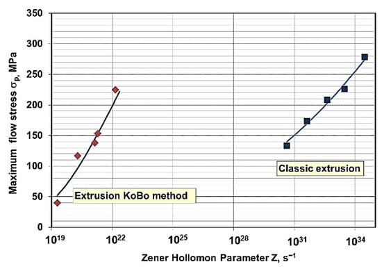 makes it possible to calculate the flow stress σpmax as a function of temperature and strain rate described with parameter Z for both samples extruded in the conventional way and those extruded concurrently. These data are presented in the graph (Figure 7). The differences in the Z parameter values for the two variants analyzed are due to the significantly lower activation energy Q for the alloy samples extruded using the KoBo method compared to the conventionally deformed alloy, i.e., 389.2 kJ/mol and 253.9 kJ/mol, respectively (Table 4). The εp (Z) dependence was not determined, since a low correlation was observed between the experimental data and those calculated according to the exponential relation.