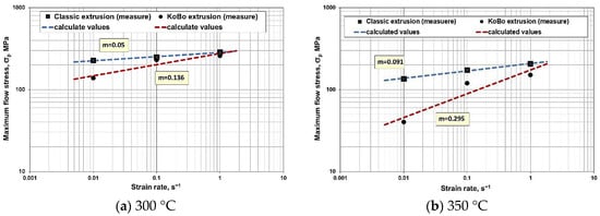 The m-factor was calculated for strain temperatures of 300 and 350 °C. The values of σp as a function of presented in logarithmic order show high consistency in the form of a linear function. For a strain temperature of 300 °C, the values of the m-factor are low: 0.05 and 0.136 for conventional extrusion and KoBo extrusion, respectively (Figure 8a). Higher strain rate sensitivity is observed at 350 °C. Conventionally extruded samples show low strain rate sensitivity, while the opposite is true for the KoBo extruded samples, which are characterized by grain fineness. The result obtained for KoBo extruded samples (m = 0.295) indicates increased ductility. It can be concluded that the material becomes superplastic under these conditions (Figure 8b).