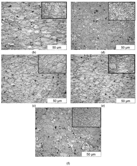 The microstructure of the investigated WE43 alloy after compression at a temperature of 250–400 °C and at a strain rate of 0.01–0.1 s−1. (a) 250 °C—0.01 s−1; (b) 300 °C—0.01 s−1; (c) 300 °C—0.1 s−1; (d) 350 °C—0.01 s−1; (e) 350 °C—0.1 s−1; (f) 400 °C—0.1 s−1.
