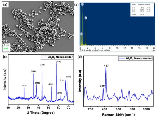 The morphology and structure of as-synthesized Al2O3 nanopowder were examined under a field emission scanning electron microscope (FE-SEM), as shown in Figure 2a. It was observed that the nanopowder was in the range of about 100 nm. Further, energy-dispersive X-ray spectroscopy was carried out to determine the elements present in the as-synthesized Al2O3 nanopowder, shown in Figure 2b. The results confirmed the presence of aluminum and oxygen in the synthesized material and no extra elements were observed other than carbon, which can be attributed to the presence of carbon in carbon tape. In addition, the structural properties of the prepared Al2O3 were analyzed under X-ray diffraction and Raman Spectroscopy (Renishaw in via Raman Microscope, Pune, India), as shown in Figure 2c,d. The diffraction profile shows peaks at 2θ~68.2°, 66.3°, 57.6°, 52.4°, 43.7°, 37.8°, 35.2°, and 25.3° can be attributed to 300, 214, 116, 024, 113, 110, 104, and 012 planes (JCPDS No 46-1212), confirming the formation of α-Al2O3 with hexagonal structure []. The average crystallite size obtained from peaks was 27 nm using the Debye–Scherrer formula, as shown in Equation (7):