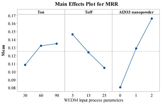 The significance of the WEDM variables on MRR is illustrated in Figure 3. The MRR value was enhanced with an increase in the concentration of Al2O3 nanopowder. The MRR has improved substantially with the increase in Al2O3 nanopowder, as the sparking frequency and thermal conductivity of the dielectric fluid increases []. This further increases the rate of erosion of the work material and gives the increase in MRR. From Figure 3, upon increasing Ton, the value of MRR was improved. As Ton increases, discharge energy and spark intensity also increase []. Discharge energy gets converted into thermal energy. Thermal energy melts and vaporizes the material from the work surface []. Thus, higher thermal energy erodes more material from work, and thereby, increases the MRR. Toff was found to have a reverse on MRR, in comparison to Ton. An increase in Toff reduces the intensity of the spark [,]. This further reduces the discharge energy, and subsequently, the MRR value also decreases with an increase in Toff.