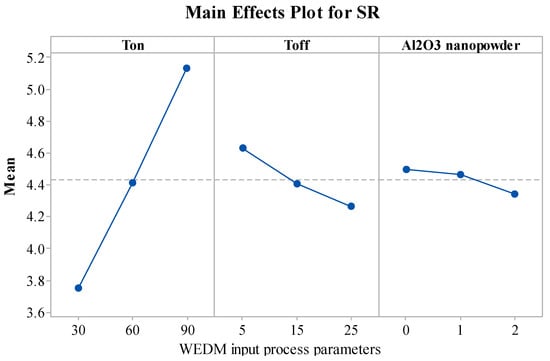 Figure 4 describes the significance of the WEDM variables on the SR response. SR of the machined components was found to follow an increasing trend with a rise in the value of Ton. The rise in the Ton value increases the discharge energy, which in turn increases the thermal energy [,]. Due to higher discharge energy and thermal energy, plasma channel pressure increases, impulsive forces are created, and this produces rough and irregular surfaces []. Thus, due to the higher thermal energy, SR value increases with an increase in Ton value. The declined trend was noticed in SR with an increase in Toff. An increase in Toff decreases the discharge energy and small craters are created [,]. This increases the quality of the surface by decreasing the SR value. Another reason for the decreasing SR is that with an increase in the Toff value, the flushing of debris gains more time and it removes the unwanted eroded particles from the machined zone [,]. From Figure 4, by increasing the Al2O3 amount, a decrease in the SR was identified. The addition of nanopowder concentration expands the interelectrode gap and also increases the heat dissipation in the dielectric fluid by forming small craters and reducing the plasma heat flux [,]. The addition of Al2O3 nanopowder enhances the flushing of debris from the machining zone. Improved flushing of debris forms small ridges resulting in improved surface quality [].