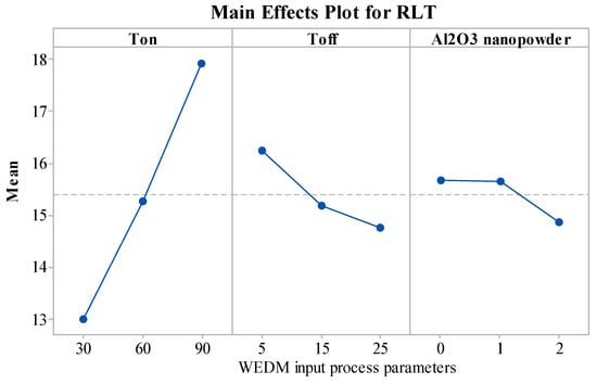 - The main effect plots for MRR, SR, and RLT illustrated that the addition of Al2O3 nanopowder improved the performance of all response variables.