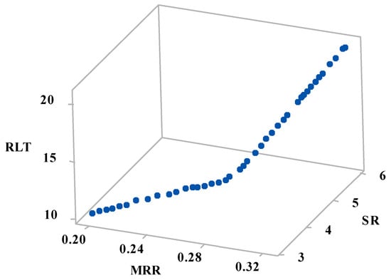 Table 7 shows the 48 Pareto points of multi-objective optimization, where each point represents a unique optimal combination of machining variables between the bounds. The optimal Pareto curve for the three response parameters was plotted in 3D with X, Y, and Z-axis representing MRR, RLT, and SR, respectively, as shown in Figure 6. Each combination of the machining variables selected from the Pareto front will yield optimum machining results, with the intended objective of maximizing MRR and minimizing RLT & SR. The input parameters Ton, Toff, and Al2O3 nanopowder influence the response parameters concerning the magnitude of variables and the selection of the optimum combination of machining variables is left to the user for attaining the desired outcome.
