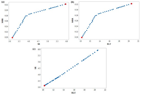2D Pareto graph (a) MRR vs. SR, (b) MRR vs. RLT, and (c) SR vs. RLT.