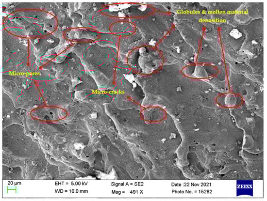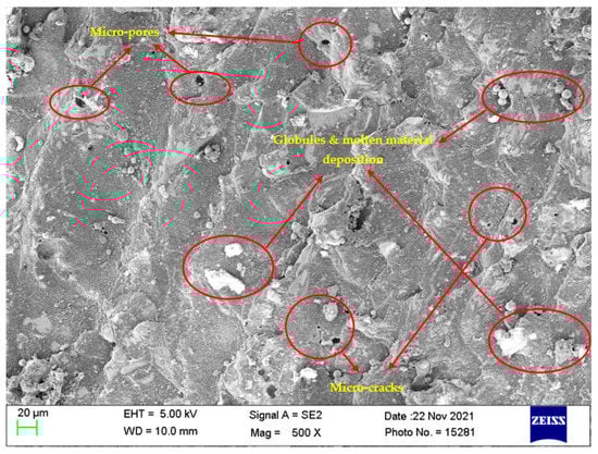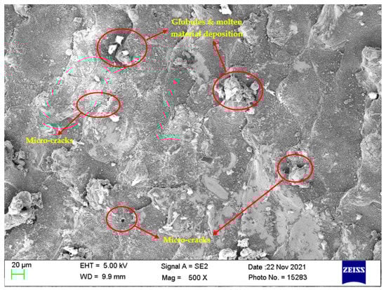 Investigation of the machined surfaces was carried out using FE-SEM. Specimens were explored for a surface morphological study through the SEM technique at 500× magnification. The optimal parameter settings obtained through simultaneous optimization of responses (Equation (5)) were used to study the surface morphology of the obtained machined surfaces at different nanopowder concentrations. The simultaneous optimal parameter settings have a Ton of 31 µs, Toff of 12 µs, and Al2O3 conc. of 2 g/L. Surface morphology analysis was carried out to find the effect of Al2O3 conc. According to this, Al2O3 conc. was varied at 0 g/L, 1 g/L, and 2 g/L, while keeping Ton and Toff at their optimal values of 31 µs and 12 µs, respectively. Figure 8, Figure 9 and Figure 10 illustrate the SEM micrographs at Al2O3 conc. Of 0 g/L, 1 g/L, and 2 g/L, respectively. A large number of surface defects can be observed in Figure 8. A large amount of melted material deposition, micro-cracks, globules of debris, and micro-pores was found on the machined surface. Figure 9 (Al2O3 amount of 1 g/L) shows improved surface in terms of reduction in surface defects in comparison with Figure 8 (Al2O3 amount of 0 g/L). A substantial improvement can be observed in the surface morphology of Figure 10 (Al2O3 amount of 2 g/L), which clearly shows a major reduction in surface defects. A large reduction in melted material deposition, micro-cracks, globules of debris, and micro-pores can be seen in Figure 10. This clearly shows that the addition of Al2O3 amount has reduced the surface defects to a larger extent. The addition of nanopowder creates uniform sparking among the work–tool interface [,]. This uniform sparking between work and tool has reduced the micro-crack substantially []. The addition of nanopowder concentration expands the interelectrode gap and also increases the heat dissipation in the dielectric fluid by forming small craters and reducing the plasma heat flux [,]. In turn, this reduces the surface defects of the melted material deposition, formation of globules, and micro-pores. The addition of Al2O3 nanopowder enhances the flushing of debris from the machining zone []. The improved flushing of debris forms small ridges resulting in improved surface quality.