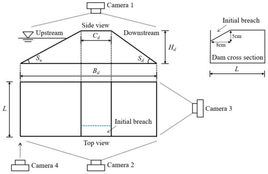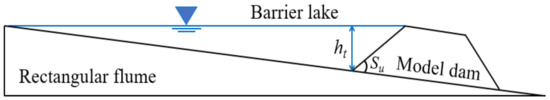 The dam with a trapezoid longitudinal section was simulated in the experiments, as shown in Figure 2. The dam height Hd was 0.24 m, considering that the flume height was 0.40 m. The upstream and downstream slopes of the dam were 1:2 (Su = 26.6°) and 1:1.5 (Sd = 33.7°), respectively, because the slope of a natural landslide dam is between 11–45° [42]. The dam crest width Cd along the flow direction was 0.24 m and the dam bottom width Bd was 1.08 m, in light of the ratio of dam height to dam crest width of a natural landslide dam ranges from 0.2 to 3.0 [33]. The transversal section of the dam was a rectangle, and the dam length L was 0.40 m to match the flume width, seen in Figure 2. A triangular initial breach (depth × width = 5 cm × 8 cm) was excavated on the dam crest to simulate the artificial spillway constructed in a natural landslide dam (Figure 2). The initial breach was adjacent to the flume sidewall, allowing the breach dimension and the water depth in the breach to be captured accurately. The dam was located 2.1 m away from the front section of the flume, considering that the dam region constituted the central section of the channel.