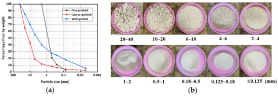 The dry density ρd of the dam in the experiments was determined to be 1780 kg/m3, which was similar to the drillhole data of natural landslide dams [21,33,42]. The model dam was prepared by mixing pebbles and quartz sands in different proportions. The pebbles and quartz sands were sieved into 10 different ranges of grain size: 20–40, 10–20, 6–10, 4–6, 2–4, 1–2, 0.5–1, 0.18–0.5, 0.125–0.18, and ≤0.125 mm, as shown in Figure 3b. Firstly, the percentage content of each granular group was determined according to the required grain composition (Figure 3a). Secondly, the weights of different groups were obtained after the total mass of the dam was calculated. Finally, the granular groups were adequately mixed by repeated stirring to make the dam materials homogeneous.