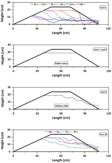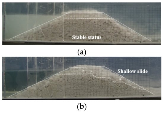 For the dams with the coarse-grained material in Test 7 (Qin = 0.5 L/s) and Test 8 (Qin = 0.75 L/s), the landslide dams did not fail, and remained stable for more than 1 h, as shown in Figure 7a. The considerable seepage was initially observed on the downstream slope before overflowing. The larger seepage flow can be observed with higher upstream water level. Most finer grains below the seepage line were transported downstream, and the seepage flow was muddy. Nevertheless, the seepage-induced transport was too weak to loosen dam structure and remove coarser grains. After the drainage water overflowed, the initial breach and the initial breach did not develop, which meant that the outflow did not have enough energy to erode the coarse-grained materials. Eventually, the upstream water level remained unchanged, and the outflow water gradually cleared. For the dam with the coarse-grained material in Test 9 (Qin = 1.0 L/s), when the inflow discharge increased, a shallow slide near the downstream crest of the dam occurred after overflowing, as shown in Figure 7b. The initial breach got deepened and broadened by the slide, subsequently magnifying the outflow discharge. Afterwards, the inflow–outflow reached balance, and the dam was restored to stable status again. All the above experimental results reflected the extremely stable structure of the coarse-grained material dam.
