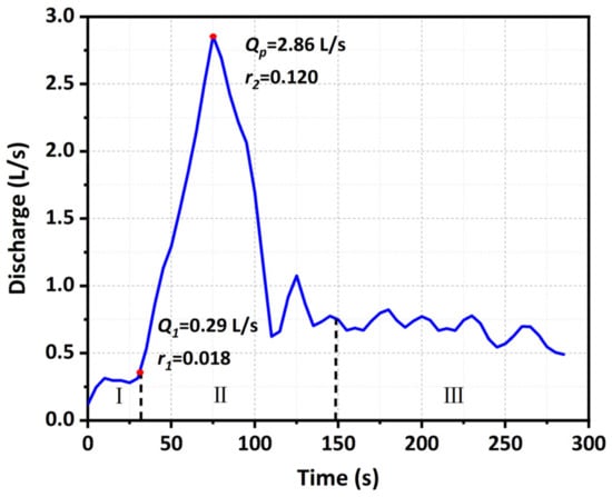 As the breaching characteristics of landslide dams with different grain compositions were distinct, clearly defining and dividing the stages of the breaching process could facilitate the quantitative comparison of different tests. Based on the dam longitudinal section evolution (Figure 9) and outflow discharge hydrograph (Figure 10), the breaching process was generalized as three distinct stages (taking Test 1 as an example). Stage I (the breach initiation stage) started from the moment when the overflow was released from the downstream crest of the dam. During Stage I, the water depth in the breach was shallow, and the flow velocity was small, which resulted in slow development of the breach. Both the outflow discharge and its changing rate were small (Q1 = 0.29 L/s, r1 = 0.018), as shown in Figure 10. Stage I ended when the dam crest was completely eroded. During Stage II (the breach development stage), the erosion process was substantially accelerated because a large amount of water was released downstream. The breach simultaneously developed in both vertical and lateral directions. The outflow discharge rapidly increased (r2 = 0.120, and r2 ≫ r1) and reached the peak (Qp = 2.86 L/s), seen in Figure 10. Stage II ended when the apparent erosion stopped at the breach entrance. During Stage III (the attenuating and reequilibrium stage), the erosion balance was achieved, and the breach reached its final dimensions. The outflow discharge gradually attenuated and eventually equalized with the inflow discharge. The whole breaching process of landslide dams ended.
