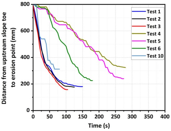 The erosion rates in different directions of landslide dams were summarized in Table 4. The headward erosion significantly developed during the breaching process. The movement processes of the erosion points in the experiments were shown in Figure 11. The erosion point was the same as the invert point on the dam longitudinal profile, which indicated the loss of control and the retreat of breach channel [60]. The experimental results revealed that, with the same inflow discharge, the headward erosion rate Eh for the fine-grained dam was larger than the value for the well-graded dam (Table 4), because the shear strength of the fine-grained material was lower. With the same dam material, the headward erosion rate Eh for the fine-grained dam linearly increased with an increase in the inflow discharge Qin (Tests 1–3). However, the headward erosion rate Eh for the well-graded dam nonlinearly increased (Tests 4–6): its increasing value was amplified by the increasing inflow discharge (Table 4). The reason for this discrepancy was that the headward erosion rate was simultaneously associated to the flow velocity and scarp height [61,62]. The larger inflow discharge significantly increased the scarp height for the well-graded dams (Figure 9), inducing more potential energy of the stored water to be transformed into the kinetic energy. For the coarse-grained dam when Qin = 2.0 L/s (Test 10), the erosion point intermittently moved towards the upstream slope toe but at a high average speed (Eh = 6.19 mm/s), as shown in Figure 11. This was because of the dam body slide and the grain transportation process similar to a debris flow, which almost instantaneously improved the headward speed of the erosion point.