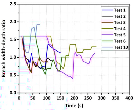 The development of the ratio of breach top width to breach depth Bt/D in the experiments was shown in Figure 12. The experimental results revealed that all the changing curves of the breach width–depth ratio Bt/D were nonlinear with time. More specifically, the vertical erosion was the predominant erosion mechanism during Stage I, and then the vertical and lateral erosions simultaneously developed during Stage II. Finally, the lateral erosion became predominant in the early phase of Stage II. With the same inflow discharge, the final breach width–depth ratio Bt/D for the fine-grained dam was smaller than the value for the well-graded dam (Figure 12). This breach development result was consistent with the observations of Jiang et al. (2018) [38]. With the same dam material, the final breach width-depth ratio Bt/D decreased with an increase in the inflow discharge Qin (Figure 12). The relationships between the final breach width–depth ratio, fine content, and inflow discharge reflected that the increasing fine content and inflow discharge were more inclined to strengthen the vertical erosion rate than the lateral erosion rate. The reason was that the breaching duration obviously decreased with an increase in the fine content and inflow discharge (Table 3), inducing a rapid decrease in the upstream water level, and the vertical erosion on the breach channel developed earlier than the lateral erosion. Consequently, the final breach of the dam with more fine content was deeper and narrower than that of the dam with less fine content. For the coarse-grained dam when Qin = 2.0 L/s (Test 10), it was interesting that the final breach width–depth ratio (Bt/D = 1.93) was larger than the initial value (Figure 12). One reason was that the erosional resistance of the coarse-grained material was so large that the breach depth was relatively small (Table 4). On the other hand, the loss of coarse grains during dam body slides substantially loosened the dam structure, leading to the frequent occurrences of lateral collapses with larger volumes.