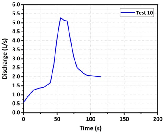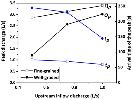 With the same dam material, the larger the inflow discharge Qin was, the larger the peak outflow discharge Qp was, and the earlier the arrival time of the peak tp was, as shown in Table 3 and Figure 14. The reason was that the larger inflow discharge caused a higher upstream water level at the end of Stage I, which led to a stronger erosion force acting on the breach channel. Nevertheless, the linear relationship between the arrival time of the peak and inflow discharge for the fine-grained dams (Tests 1–3) was very weak (Figure 14) because the duration of Stage I hardly changed with an increase in the inflow discharge (Table 3). Unlike the fine-grained dams, the duration of Stage I for the well-graded dams obviously decreased with an increase in the inflow discharge (Table 3), which significantly shortened the arrival time of the peak. This above discrepancy was related to the distinct breaching characteristics, which basically resulted from the water–sediment interactions during the breaching process. The experimental results also revealed that the disparity of the peak discharge between the fine-grained dam and well-graded dam was gradually reduced with an increase in the inflow discharge Qin (Figure 14). The reason was that, compared with the fine-grained dam, the erosion rates in the vertical and lateral directions for the well-graded dam increased faster with an increase in the inflow discharge (Table 4), accelerating the increase of the outflow discharge. Moreover, the hydrograph shape tended to vary from a multimodal one to a unimodal one with an increase in the inflow discharge Qin. Because of this, when the inflow discharge was smaller (i.e., Qin = 0.5 L/s), the sediments from lateral collapses might have blocked the breach channel temporarily and interrupted the outflow, resulting in a peak in the hydrograph. As the blockage was scattered and pushed away, the outflow continued and reached another peak discharge. However, when the inflow discharge was larger (i.e., Qin = 1.0 L/s), the outflow was large enough to push away the sediments in the breach quickly. For the coarse-grained dam, when Qin = 2.0 L/s (Test 10), the discharge hydrograph was shaped into a very thin, high type (Figure 15), because the upstream water level increased first and then decreased rapidly as the dam failed by overtopping in a short time. The extreme large inflow discharge considerably overwhelmed the effects of dam material on the outflow discharge and tremendously increased the risks and dangers of the dam breaching.