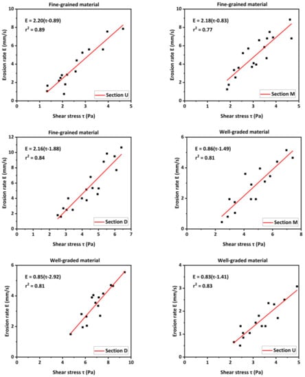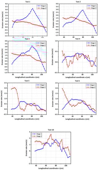 where Ei is the erosion rate, and is the erosion depth during the time interval . The distributions of the erosion rates along the flow direction during Stages I and II in the experiments were shown in Figure 16.