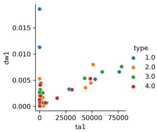 Figure 8, Figure 9, Figure 10 show the graphs in which the layers are assigned to classes, i.e., non-modified surface (class 1) and modified surfaces (classes 2, 3, 4). The differences between the individual lines corresponding to the classes are visible. Especially for class 4 (Y2O3), we observe a different slope of the obtained straight lines. Analysis does not reveal a quantitative but a qualitative relationship, indicating the effects of the additives on the parameters determined.