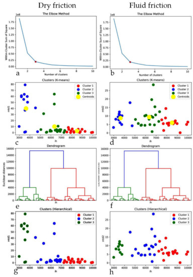 Cluster analysis for dry and fluid friction. Determination of optimal number of clusters using: (a,b) Elbow method; (c,d) clusters with centroids determined by K-means algorithm; (e,f) determination of optimal number of clusters for Hierarchical method using dendrograms; (g,h) clusters determined by Hierarchical algorithm.