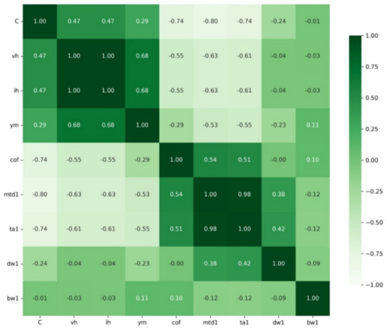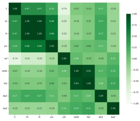 Pearson’s correlations show that in the case of dry friction, a very strong negative correlation occurs between C-cof, C-mwd1, and C-ta1 and a very strong positive correlation occurs between vh-ih and ta1-mwd1. Pearson’s correlation coefficient is a measure of linear correlation between two sets of data. In contrast, for fluid friction, a very strong negative correlation occurs between C-cof with a very strong positive correlation between ta2-mwd2. The results are summarised in Table 8. The correlation values are shown in Table 9.