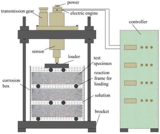 The 28 d flexural strength was used as the initial strength to calculate the loading stress level. The mechanical erosion cyclic test device is shown in Figure 1. The loading system was customized, based on the universal mechanical testing machine, and patented (Chinese patent number: CN201819856U).