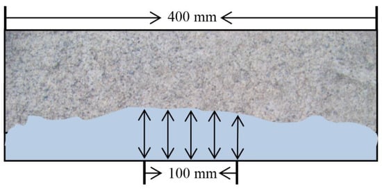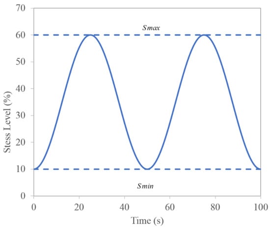 The specimens with five surfaces were sealed with epoxy and plastic wrap; one side was selected as the exposed surface to bear up the erosive solution as well as the cyclic loading. The treated specimens were immersed in a container filled with a prepared erosive solution (8% NaCl, 8% NaCl + 5% Na2SO4, 8% NaCl + 10% Na2SO4). The cyclic loading was a sine wave function increasing from a stress level of 10% (Smin) to 60% (Smax), then dropping back to 10% (as shown in Figure 2), with a 50 s full cycle (0.02 Hz). More details can be found in the literature [22]. This cycle continued throughout the salt ingression. The loading durations were 20 d, 40 d, 60 d, 80 d, and 100 d, respectively. Table 3 shows the experimental program of the cyclic loading condition and salt ingression.
