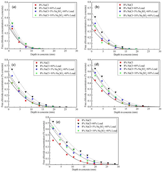 Chloride concentration distribution of concrete immersed in different sodium sulfate and sodium chloride coupling of cyclic loading condition. (a) 20 d; (b) 40 d; (c) 60 d; (d) 80 d; (e) 100 d.