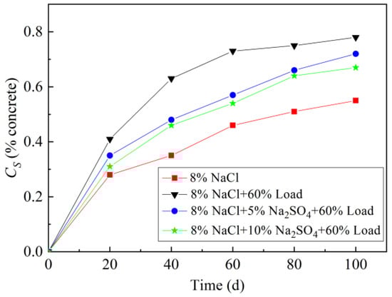 The existence of load and sulfate ion did not change the general rule of chloride ion distribution in concrete, and the distribution of chloride ion concentration in concrete still complies with Fick’s second law (Figure 4). The chloride ion concentration at different depths under cyclic loading increased significantly compared with the immersion test. At a depth of 4.5 mm, the concentration of chloride was increased from 1.55 to 1.93 times while at the depth of 7.5 mm, the increase was between 1.66 to 2.11 times. The concentration of the chloride ion (100 d) at the depth of 7.5 mm was about 2.11 times of that without loading.