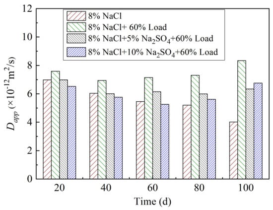 Concrete Dapp decreases first and then increases with the increase of the loading erosion age (Figure 6). Compared with the coupling effect of loading and single chloride salt, the Dapp of concrete decreased gradually with the addition of sulfate before 80 d and decreased gradually with the increase of the sulfate ion concentration. When the erosion age is 100 d, Dapp of 10% Na2SO4 test is slightly greater than that of 5%. When the erosion age is less than 80 d, the existence of sulfate ion will make the concrete structure denser, which delays the deterioration of concrete. When the erosion age is 100 d, with the high sulfate concentration, more crystallization products are generated; this leads to the internal cracking of concrete, which is manifested by the larger Dapp when the sulfate concentration is high.