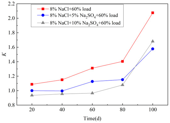 The concrete effect coefficient K increases with the extension of the erosion age (Figure 7). Under the action of the 60% cyclic bending load, the K value is always greater than 1, which promotes chloride ion transport. Before 80 d, the K value decreased with the introduction of sulfate. The higher the sulfate concentration, the lower the K value was. When the erosion age was 100 d, the K value under the cyclic load of 10% sodium sulfate exceeds the concentration of 5%. It was caused by the combination of the compactness of sulfate crystallization products and cyclic load damage. Before 80 d, the interaction between the two was manifested as the compaction of sulfate crystal products, and the higher the concentration, the more promoted effect. As the concentration increased, the rate of crystallization product formation increased as well. This gradually changed the filling effect to expansive pressure induced by salt crystallization in confinement, which led to the increase of the concrete K value. At 100 d, the existence of sulfate crystals still played a filling role in general, so the K value was lower than that under the single cyclic load.