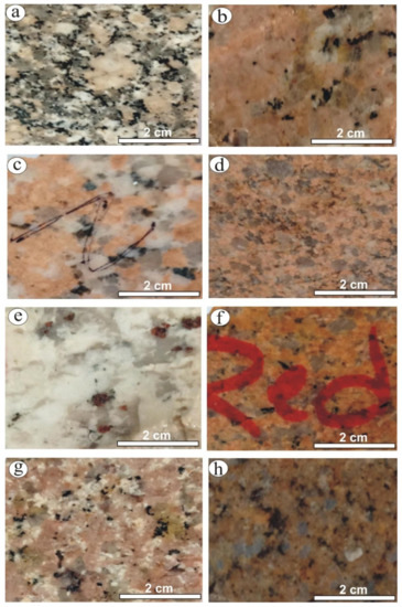 Photographs showing hand specimens of the granitic rock types: (a) Gandonna, (b) pink granite, (c) buff granite I, (d) buff granite II, (e) Fantazia, (f) red granite, (g) Rosa granite, (h) Qusseir brown.