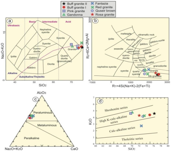 Classification of the studied granitic rocks using (a) SiO2 vs. Na2O + K2O diagram after Cox et al. [24]; (b) the R1-R2 diagram (De la Roche et al.) [25]. Magma type diagrams of (c) CaO-(Na2O + K2O)-Al2O3 discrimination diagram (Shand) [26] and (d) SiO2 vs. K2O diagram (Rickwood) [27].