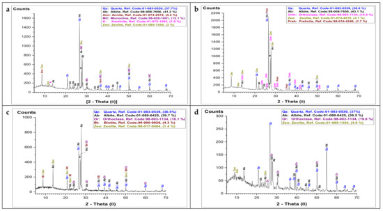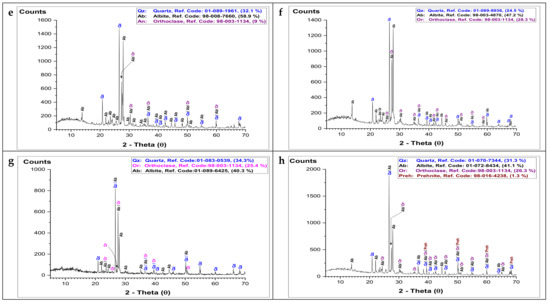 As shown in Figure 5, the mineralogical analysis of the studied granitic rock types using X-ray diffraction revealed that quartz (SiO2, reference codes (01-083-0539; 01-070-7344; 01-089-1961; 01-089-8936)),plagioclase (albite: NaAlSi3O8, reference codes (98-008-7656; 01-072-8434; 98-008-7660; 98-003-4870)), alkali-feldspar (orthoclase: KAlSi3O8, reference code (98-003-1134)), and mica (annite: K (Fe Al) (Al Si) O10 (OH)2, reference code (01-074-2572)) are the main common minerals in the studied rock types. All these minerals were detected in various percentages as given in Table 3 based on their chemical composition (Table 2); for example, the high percentage of albite mineral in the granitic rock type (e) Fantazia was matched with the high presence of Na2O: 6.05%. The X-ray investigation also revealed a presence of alterations in some rock types, such as (a) Gandonna, (b) Pink granite, and (h) Qusseir brown. Such alterations are indicated by the existence of secondary minerals such as zeolite (Na2Al2Si3O10.2H2O, reference code (01-085-1554)), prehnite (Ca2Al2Si3O10.(OH)2, reference code (98-016-4246)) and kaolinite (Al2Si2O5(OH)4, reference code (01-075-1593)).