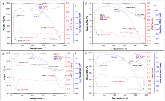 The thermogravimetry (TG) and differential thermogravimetry (DTG) curves, as graphically plotted in Figure 6, showed a variation in the mass as a function of temperatures. A significant mass loss was observed at various temperatures less than 200 °C for all rock types that represented the evaporation of physically (absorbed) and chemically bonded water that was liberated at 300 °C [34,35,36,37]. In this study, the reduction in mass because of the release of physically free (absorbed) and chemically bound water up to 200 °C was found to be 1.949%, 1.210%, 1.093%, 0.164%, 0.471%, 0.257% for Gandonna (a), pink granite (b), buff granite II (d), fantazia (e), rosa granite (g), and qusseir granite (h) at temperatures of 137 °C, 150 °C, 137 °C, 85 °C, 132 °C, and 96 °C, respectively. The rock types buff granite I (c) and red granite (f) showed an inconsiderable mass loss at that range of temperatures, which was confirmed by their thermo-gravimetric derivative peaks at the same figure that indicated a very low rate of mass change by time (%/min.). A further mass loss was observed with excessive heating between 400 and 800 °C. Such loss in mass was attributed to the releasing of crystal water [36,37] or water-bearing mineral phases [34].