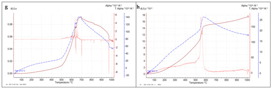 As shown in Figure 7, the first sharp increase in the linear thermal expansion coefficient of the studied igneous rocks was detected around 570 °C, which represented the quartz mineral (α-β transition phase) that appears at 573 °C [39]. This phase is supported by the appearance or jump in the peak of the thermal coefficient rate (dα) in the same figure; in addition, it is well confirmed in the curve of differential scanning calorimetry (DSC) (Figure 6). A second increase or jump in the coefficient of linear thermal expansion was observed in the range of 700 to 900 °C for some rock types ((a) Gandonna, (b) pink granite, (c) buff granite I, (d) buff granite II). Such an increase is also supported by a second appearance or jump in the peak of thermal coefficient rate (dα) in the same figure, which may be related to the high percentage of quartz in their composition (Table 3). It could be attributed to the phase transition of quartz to hexagonal tridymite at about 800 °C [39]; however, this transition was not indicated in the differential scanning calorimetry (DSC) curve. As given in Table 4, an increase in the values of the linear thermal expansion coefficient was clearly noticed with increasing temperature until 700 °C; after that, it begins to decrease with temperature increases up to 1000 °C. It was also observed that the relative change in length for all rock types of different colors did not exceed 0.015% of the initial sample length at an unusual air temperature of 50 °C.