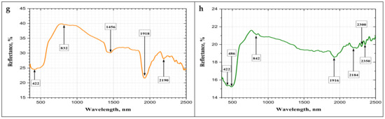 The results of bidirectional spectral reflectance of the eight igneous rock types (gandonna, pink granite, buff granite I, buff granite II, fantazia, red granite, rosa granite, gusseir brown) are graphically plotted against the wavelength in Figure 9a–h, respectively. It is observed from Figure 9 that the reflectance scale (Y-axis) for all rock types is not uniform due to the variable response of these rocks to spectral reflectance, which indicates the variation in the mineral content and type.