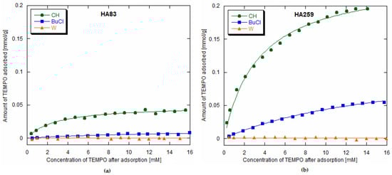 where KL [L·mmol−1] is the Langmuir constant, denoting affinity to the adsorbent; Q0 [mmol·g−1] is the maximum monolayer adsorption capacity; Ce [mM] is the equilibrium concentration of TEMPO after adsorption; qe [mmol·g−1] is the amount of TEMPO adsorbed per HA unit mass at a given point [27]. The obtained Langmuir isotherm parameters for HA83 and HA259 and the three studied solvents are juxtaposed in Table 2.