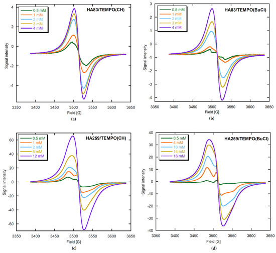 The EPR spectra of TEMPO from the obtained composites showing signal dependence on the initial radical concentration in the organic solvent: (a) after adsorption on HA83 from CH; (b) after adsorption on HA83 from 1-chlorobutane (BuCl); (c) after adsorption on HA259 from CH; (d) after adsorption on HA259 from BuCl.