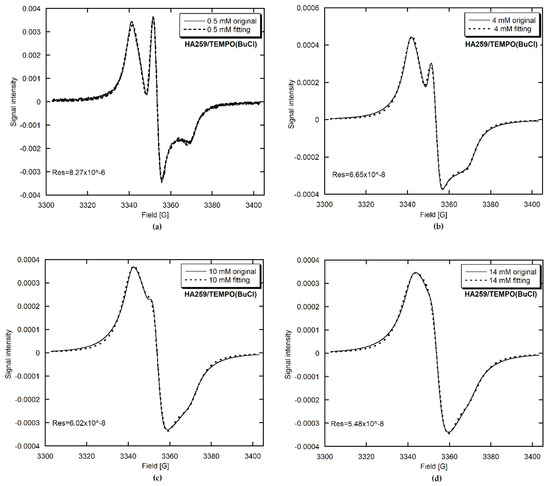 To characterize the above observations quantitatively and to study potential changes in radical mobility, we performed EPR spectra fittings with Altenbach’s MultiComponent program based on the stochastic Liouville equation and using a modified Levenberg–Marquardt minimization algorithm [21]. Concerning the fitting methodology for slow-motion spectra, we referred to the article of Budil et al. [33]. The chosen fits are presented in Figure 4, Figure 5 and Figure 6. In all cases, the fit accuracy, expressed through the sum of square residuals (Res), was satisfactory. The fitted parameters, either TEMPO-loading-dependent or not, as well as the assumptions made to simplify computations, are given in Table 4.