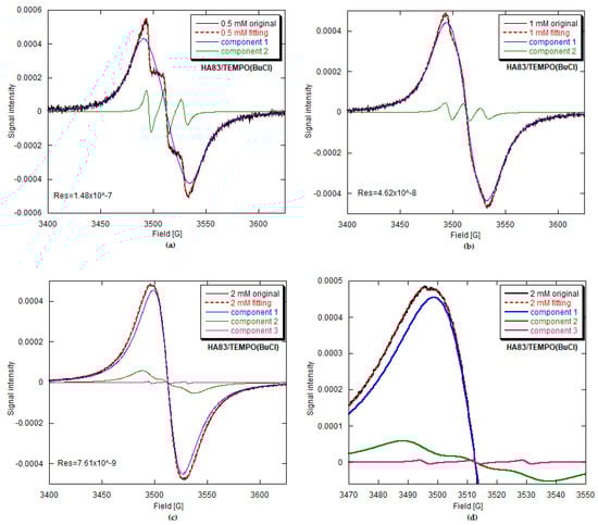 The original and simulated EPR spectra of the HA83/TEMPO(BuCl) composites prepared using three different initial TEMPO concentrations in BuCl: (a) 0.5 mM; (b) 1 mM; (c) 2 mM; (d) a magnified region of the 2 mM spectrum, justifying a contribution from the third spectral component.