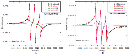 For the lowest radical concentrations, the EPR spectra of HA259/TEMPO(CH) and HA259/TEMPO(BuCl) (Figure 3) resemble those of the restricted motion case (Figure 2b). On the other hand, the spectra of HA/TEMPO(W) for both apatites include sharp triplets (Figure 6), demonstrating rather high mobility of TEMPO, which is unexpected in the solid state. No more can be said about TEMPO mobility in the HA/TEMPO composites without a rigorous computer analysis of their spectra. However, it is obvious from the visual inspection that the EPR spectra of our composites are dependent on HA, the solvent, the presence of water and the concentration of TEMPO (Figure 3, Figure 4, Figure 5 and Figure 6). The spectra can be directly analyzed in view of the resolution of the 14N hyperfine structure, the TEMPO concentration at which this structure collapses and the behavior of a peak-to-peak linewidth ∆Hpp after the collapse, measured directly from the experimental spectrum.