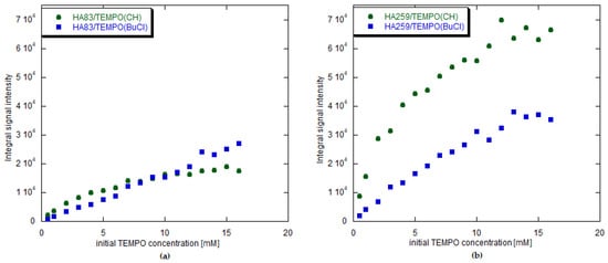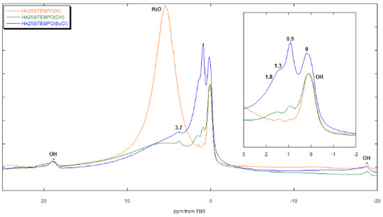 The precipitates containing HA83 were left to dry overnight at room temperature (RT) under a fume hood and were later subjected to EPR and 1H NMR studies. The precipitates containing HA259, in turn, were left to dry for two days in a desiccator flushed with argon. They were also subjected to further studies. In the rest of the work, the obtained composites are referred to in the following way: HA83/TEMPO(X) and HA259/TEMPO(X), where X denotes CH, BuCl or W, depending on the solvent used for adsorption.