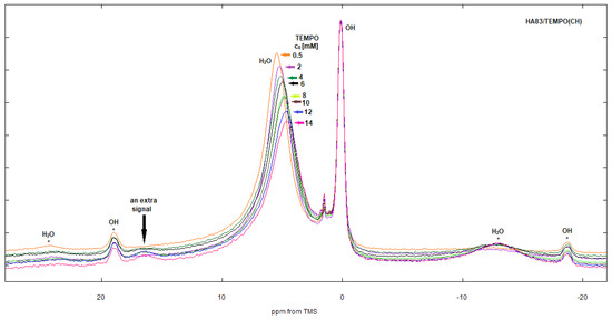 Between those extreme cases, which differ in the TEMPO molecular motion, numerous intermediate conditions can be found in our study (Figure 3, Figure 4, Figure 5 and Figure 6). Therefore, the resulting EPR spectra are best analyzed using appropriate computer programs. Additional variables to be accounted for are the magnetic dipole–dipole (DD) interaction between unpaired electrons and the Heisenberg spin exchange (SE) [32,33,34,35,36,37,38]. The former operates through space and the latter requires the molecular orbitals of unpaired electrons to be overlapped (direct spin exchange, negligible for the interspin distances over 1.5 nm) [39]. Both phenomena are dependent on the radical dynamics and distribution in a sample.