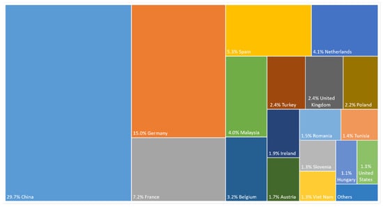 Further, indirect impacts associated with the COVID-19 pandemic concerned trade in PPE, which may become particularly significant at the national scale. For instance, a few days after the Italian government declared the lockdown on 9th March [], PPE became unavailable and sold at very high prices because of the sudden and unexpected demand. To cope with this, many Italian factories converted their production to produce PPE, especially masks []. However, given the very high demand, which reached 1 billion masks and 0.5 billion gloves per month [], Italy had to rely on imports of PPE from different countries, mainly China (about 30% of total supply cost) and Germany (15%) as shown in Figure 1 [].