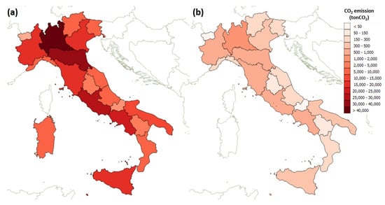 Between 2019 and 2020, the lockdown due to the pandemic allowed us to reach a decrease of about 10% in CO2 emissions in Italy []. The largest decrease, almost 18,000 kton, was found by comparing the emissions of March and April 2019 with those of the same period of the following year []. In particular, the region with the greatest decrease, about 3000 kton, was Lombardy [].