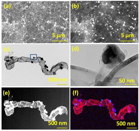 In-lens (a) and secondary electron emission (b) SEM micrographs of Ni-NCNT; Transmission electron micrographs TEM (c) and HRTEM (d) of Ni-NCNT and its corresponding dark field (e), elemental composite map (f). Scale bars are 5 µm in (a,b); 500 nm in (c,e,f) and 50 nm in (d), respectively. Blue color in (f) shows nickel moieties, and the red color shows nitrogen moieties.